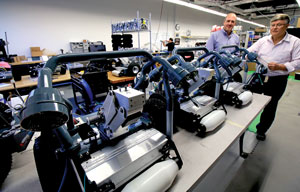 Harveys number HAI-1245, 1246 and 1247 await final assembly by Don Haras (right), manufacturing test engineer at the Harvest Automation facility in Billerica, Massachusetts. That’s CEO John Kawola looking on. “Harvey” is the pet name for Harvest’s HV-100 plant moving robot. Launched just two years ago, there are now some 150 HV-100s at work at 27 nurseries and greenhouses across the country.