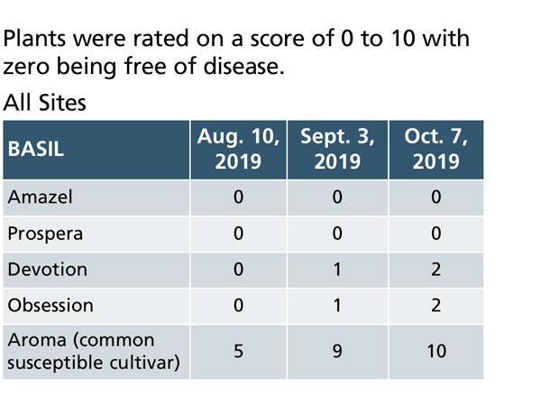 In response to questions from Maryland growers about resistant basil cultivars and continued strong demand for basil plants, we initiated a limited field evaluation of resistant basils during the 2019 growing season. Three sites in Maryland, including the Central Maryland Research and Education Center in Westminster and Finksburg, had basil known to be susceptible to downy mildew with three cultivars that were reported to be resistant.