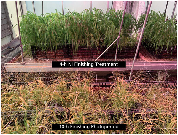 Figure 3: Witchgrass Frosted Explosion (Panicum capillare) finished under either a 10-hour photoperiod or a four-hour NI and a moderate light intensity. Plants finished under the 10-hour photoperiod flowered prematurely and no harvestable stems were produced. A four-hour NI delayed flowering long enough for sufficient stem lengths to be met, yielding a harvestable crop.