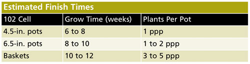 The target media pH should be 5.5 to 6.2, with an EC of 1.5 to 2.0 mmhos/cm. Apply fertilizer at a rate of 100 to 175 ppm N. For plant growth control in the finish stages, apply a paclobutrazol drench at 2 to 3 ppm at seven to 10 days after transplant, with additional applications as needed or weekly spray applications of 10 to 15 ppm paclobutrazol.