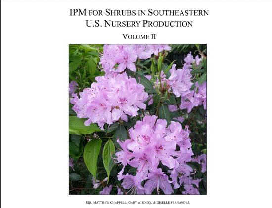 The first text is "IPM for Select Deciduous Trees in Southeastern U.S. Nursery Production" that covers Betula spp., Prunus spp., Lagerstroemia spp., Cornus spp., Ulmus parviflora, Magnolia spp., Acer spp., Quercus spp. and Cercis spp. The second text is "IPM for Shrubs in Southeastern U.S. Nursery Production: Vol I" that covers Abelia spp., Camellia spp., Rosa spp., Vaccinium spp. and Viburnum spp. The third text is "IPM for Shrubs in Southeastern U.S. Nursery Production: Vol II" that covers Hydrangea spp., Loropetalum chinense, Ilex spp., Rhododendron spp. and Rhaphiolepis spp.