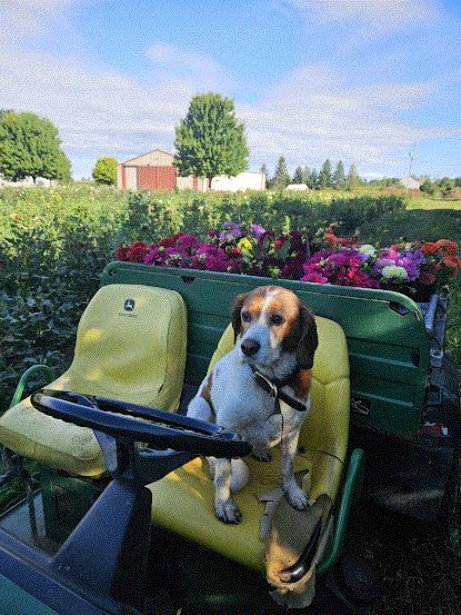 The gator is one of her favorite spots during dahlia harvests. We have an acre in production this year!