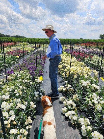 Tater and I enjoyed walking the lisianthus portion of the trial with Bob Croft from Sakata.