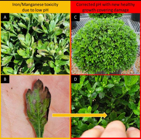 Fertilizer was switched from acidic 20-10-20 to basic 14-4-14 for one week and then continued on an alternating schedule between 14-4-14 and 20-10-20 to curb pH drop. Ammoniacal nitrogen from 20-10-20 was also needed to encourage growth past damaged leaves.