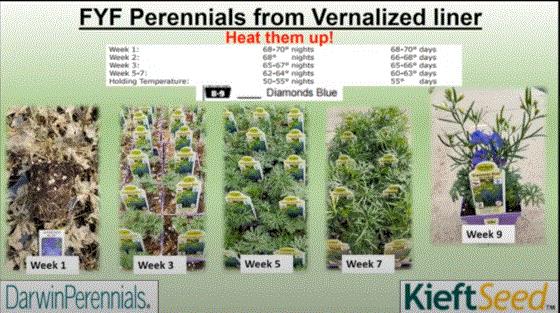 Crops produced from VERNALIZED LINERS are perhaps the quickest, easiest and most predictable way to bring first-year-flowering (FYF) perennials to market. Darwin Perennials and Kieft Seeds tech expert Chris Fifo calls these “no brainers” and explains that almost every perennial class is FYF from vernalized liner.