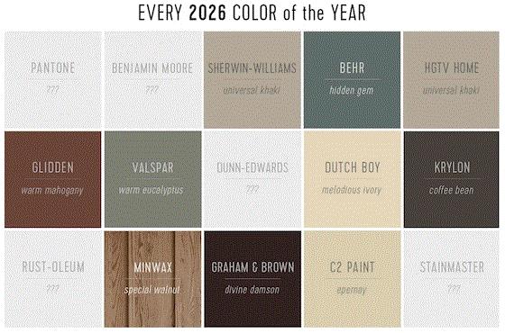 What are the on-trend colors for 2026? Glad you asked! There’s a WEBSITE that tracks the latest “Color of the Year” announcements, and you should be aware of it. Yes, there is more than one “Color of the Year,” and Pantone doesn’t necessarily own the category. Paint companies, unsurprisingly, have a lot at stake when it comes to directing color trends, so many of the “Color of the Year” colors are coming from them.