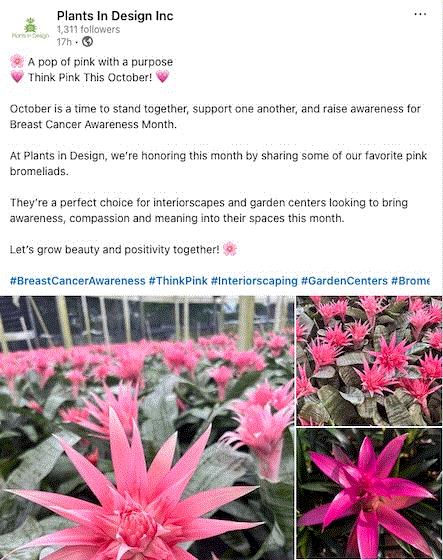 Plant In Design's recent LinkedIn post reminding us to "Think Pink" for breast cancer awareness campaigns this month.
