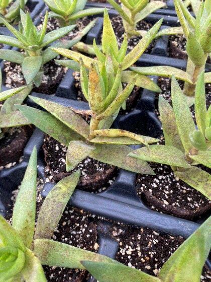 Regarding fungicide, copper-based products (like what has already been applied) can offer limited control for PM. A suggestion is to rotate in a potassium bicarbonate product for preventative control and when disease pressure is low. Good coverage is critical, as they only work where the active ingredient is actually sitting on the foliage. Use a good spreader-sticker (label permitting) for these surface-protectant type fungicides on succulents, as the thick, waxy cuticle often causes the fungicide solution to bead up on the leaf surface, leaving unprotected “shot-holes” between where the droplets dry. If pressure starts to get bad, rotate in a Group 11 fungicide that is labeled for use on succulents.