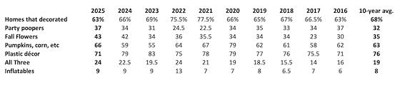 All three is the category for the avid decorator who bought flowers, agricultural products AND plastic to make the biggest splash possible. At 24% of decorators, that figure is up 1.5 points from last year and ties the best year ever, 2022. The 10-year average is just 19% and the 15-year average is 17.5%, so you can see that there’s an increase in the number of folks making the big effort.