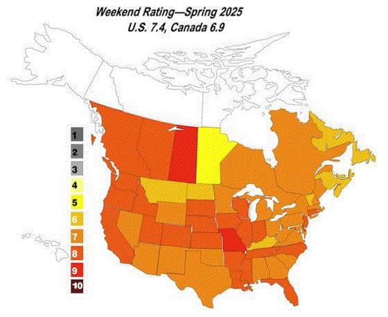 Chris reported (based on 1,251 scores over 13 weekends from the end of March through the end of June that in the U.S. overall scores (1 to 10) averaged 7.4 for the season and Canada came it at 6.9. In the 13 years he’s been conducting the survey, the average is 7.2 for both countries.