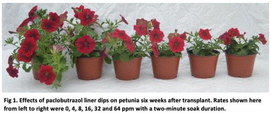 Rates and efficacy vary by species, variety and environmental conditions based on the time of year or geographical location. Southern growers generally require higher rates than Northern growers, due to warmer temperatures and higher light. For example, “low” paclobutrazol dip rates may range from 2 to 6 ppm in the South, but only 0.5 to 4 ppm in the North (Table 1). Always start with trial rates and adjust based on plant response.
