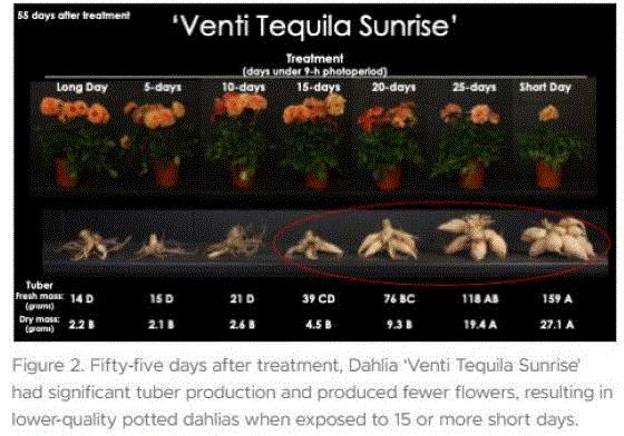 They found out if dahlias are provided 5 to 10 days of short days, it can reduce flowering time by anywhere from 3 to 24 days and can even increase flower bud count. Remember, dahlias are facultative short day plants. Meaning they can flower faster under shorter days—they grow vegetatively during long summer days and start flowering when the days get shorter later in the summer.