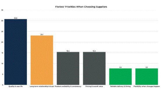 Survey shows florists value vase life and quality more than another factor when choosing their supplier for Valentine's Day blooms.