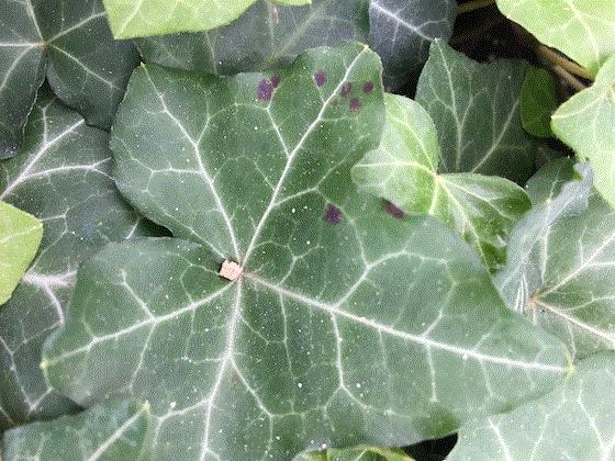 Look at this hedera. There are two things you’ll likely notice. First, you’ll notice a small piece of vermiculite resting on the center of the leaf. This is the carrier for the biologicals being applied to manage spider mites and is NOT what I want you to focus on. What I am hoping you’ll see is the presence of the small purple splotches on the leaf.