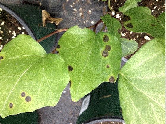 Bacterial leaf spots on hedera are caused by Xanthomonas. Early infections typically appear as those shown above, but more advanced infections will appear as small circular, dark green to nearly black water-soaked (oily appearing) spots with yellow halos surrounding them (below). The leaves may eventually turn yellow, die and fall off.